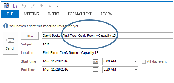 ****Note:HOWEVER DO NOT TYPE IN LOCATION BOX!!!You see, we have to invite the room to the meeting, click on the Rooms button and select the one room you want..
