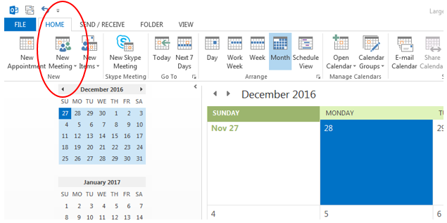 To lock in a reservation, look to the upper left under the HOME tab (same as before) but this time click New Meeting