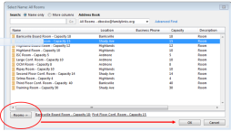 You now should see a list of rooms along with room capacities.. click on a room then click the Room button, you will notice that the room is added to the selection list. Repeat until you are satisfied with your selections.Then click OK