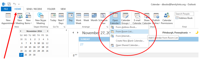 With your Calendar now displayed look to the Ribbon Bar at the top left of the screen under click the HOME tab, then select Open Calendar then click on Room List.